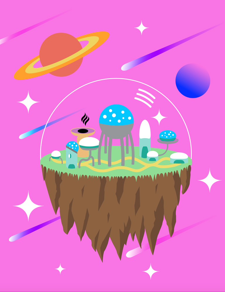 A dreamlike landscape removed from gravity.